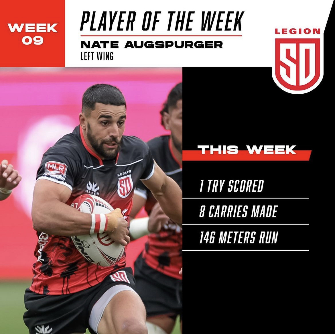 Left Winger Nate Augspurger was named to the MLR 'First XV' for Round 9 as well as 'Player of the Week' for his outstanding performance on 4/16.
